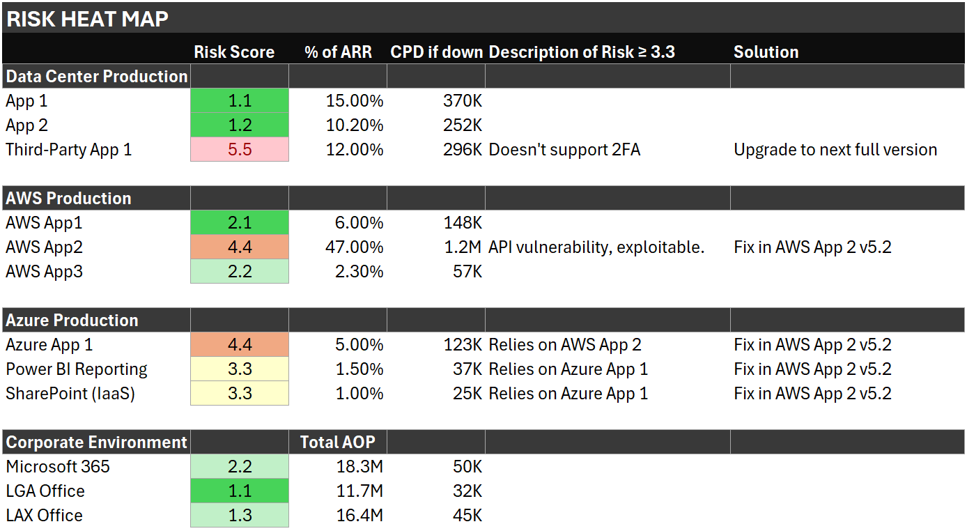 For internal systems that don’t generate revenue, I measure risk in terms of Annual Operating Expense (AOP) and CPD if down. As part of my discussion, I address productivity loss, regulatory reporting requirements, and reputational exposure — the universal metrics every board understands.